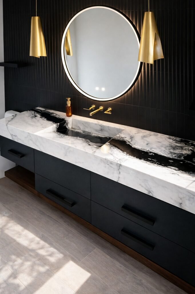 We specialize in custom bathroom countertop fabrication using advanced CNC machinery and high-end fabrication tools. In this case, we tailor surfaces to exact vanity dimensions — including curved layouts, integrated sink modules, or double-sink configurations.