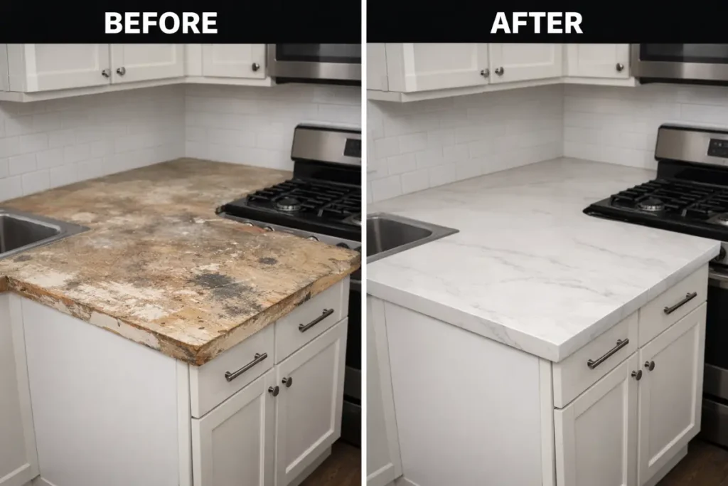 The before image shows an old, damaged countertop with visible wear, stains, and deterioration, reflecting years of use and an expired surface condition.
